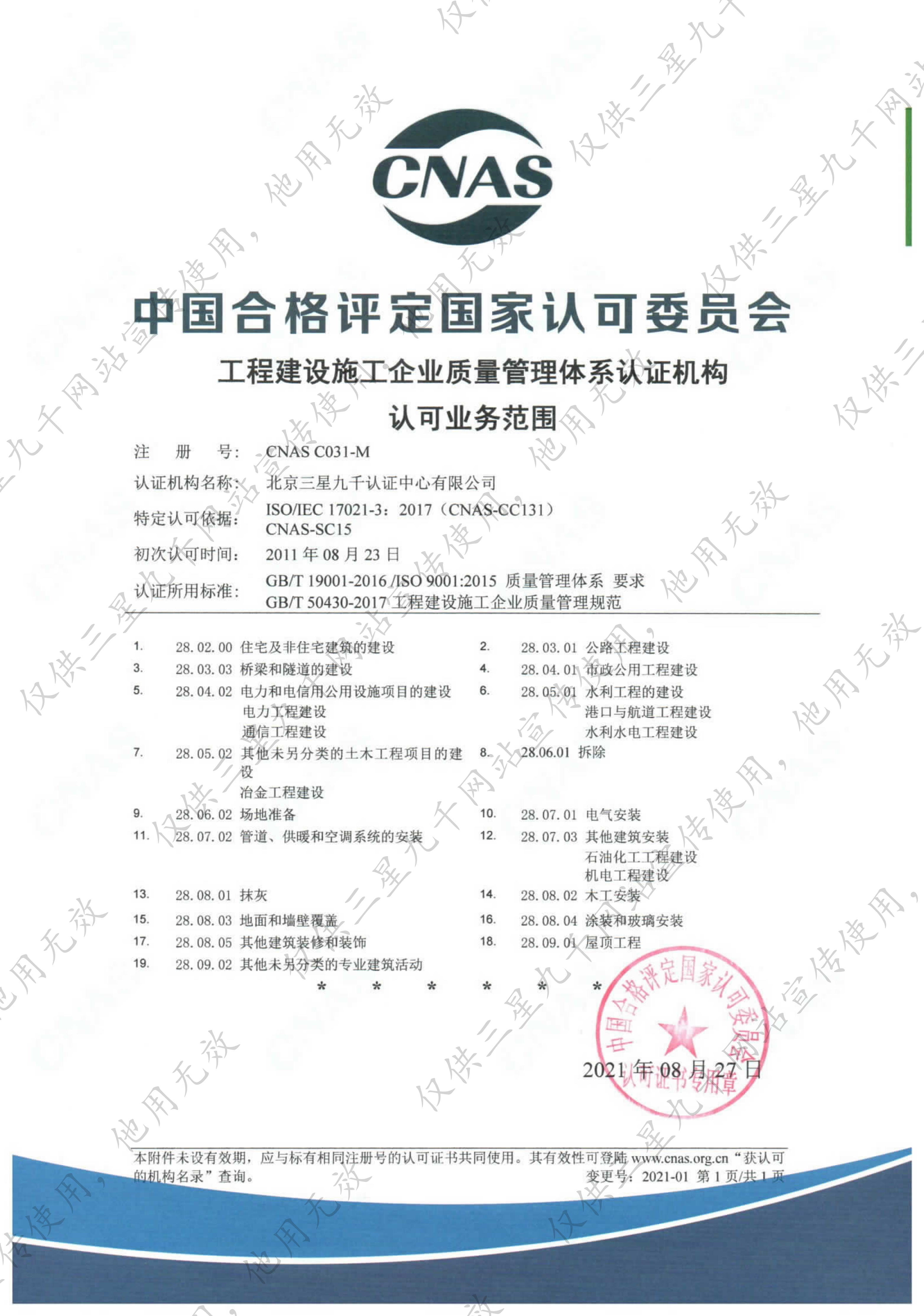 工程建设施工企业质量管理体系认证机构认可业务范围证书