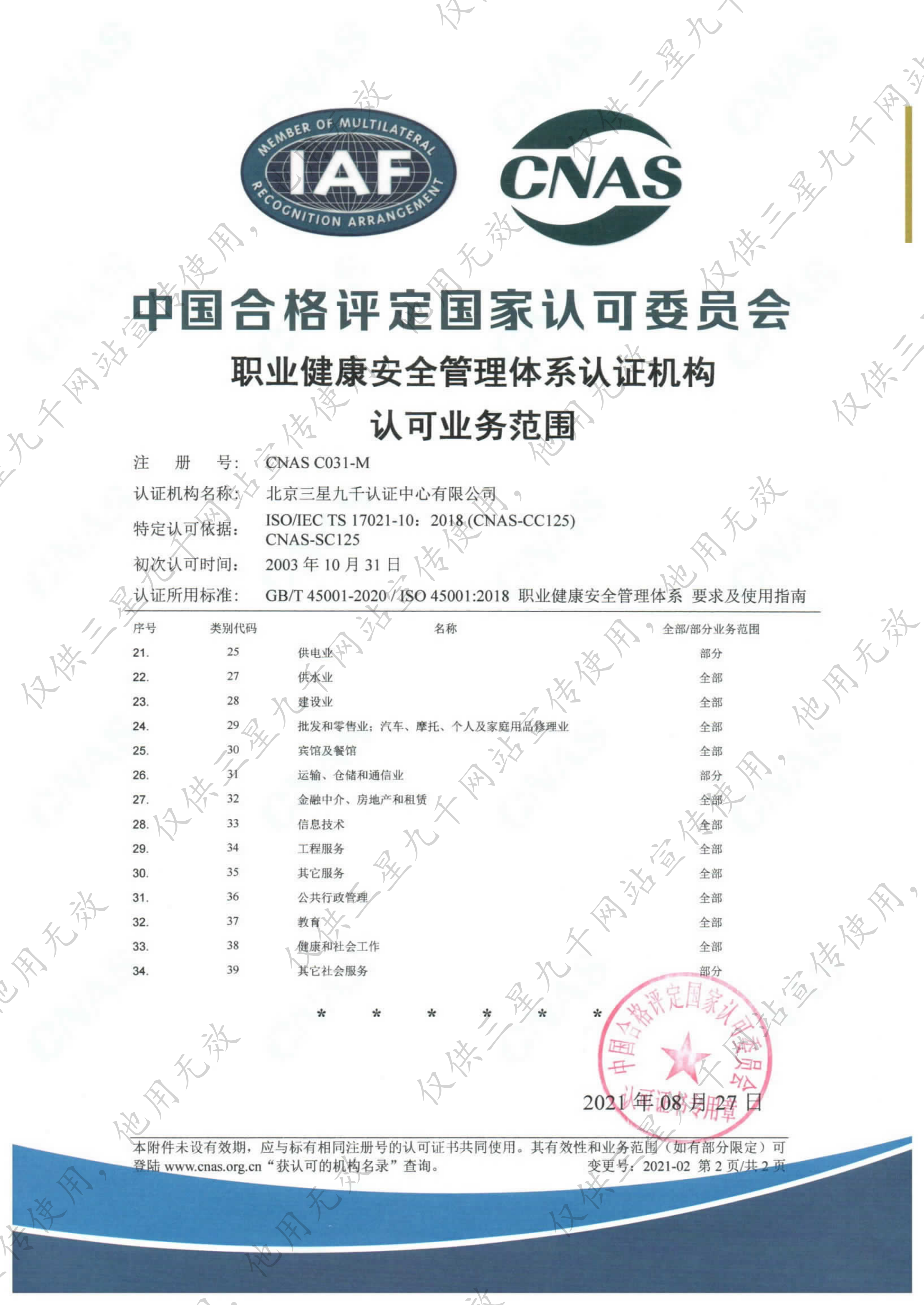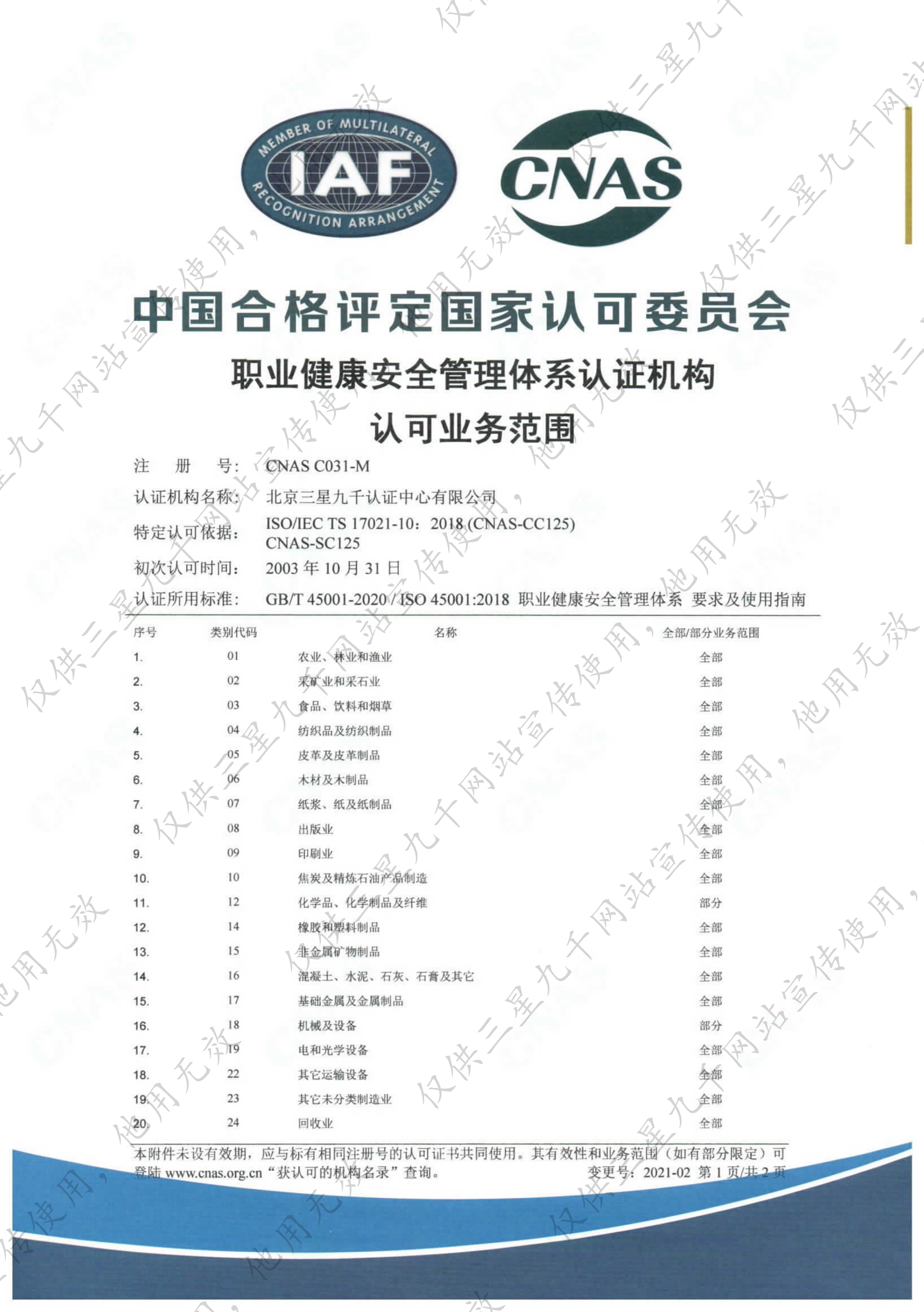 职业健康安全管理体系认证机构认可业务范围证书-2