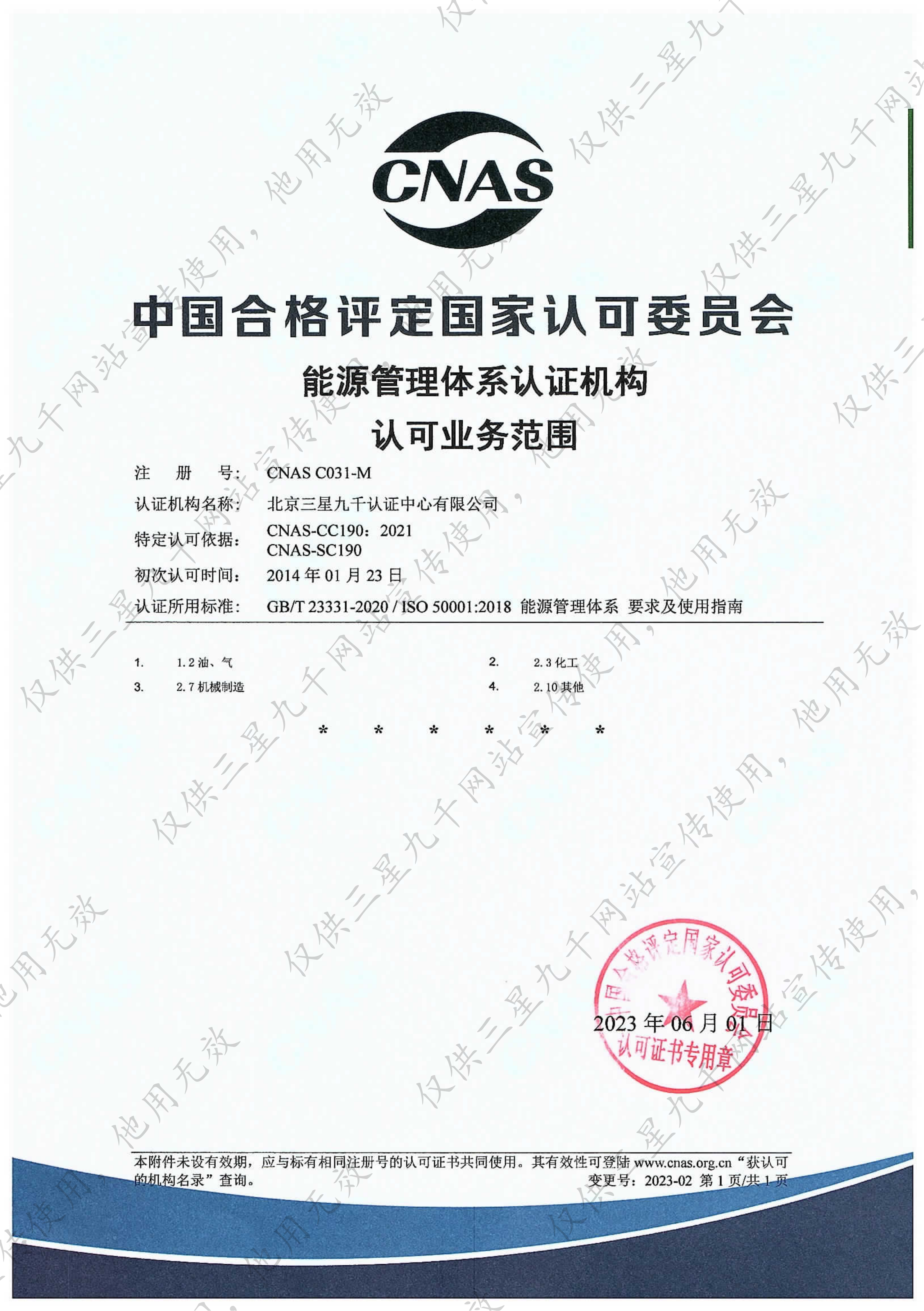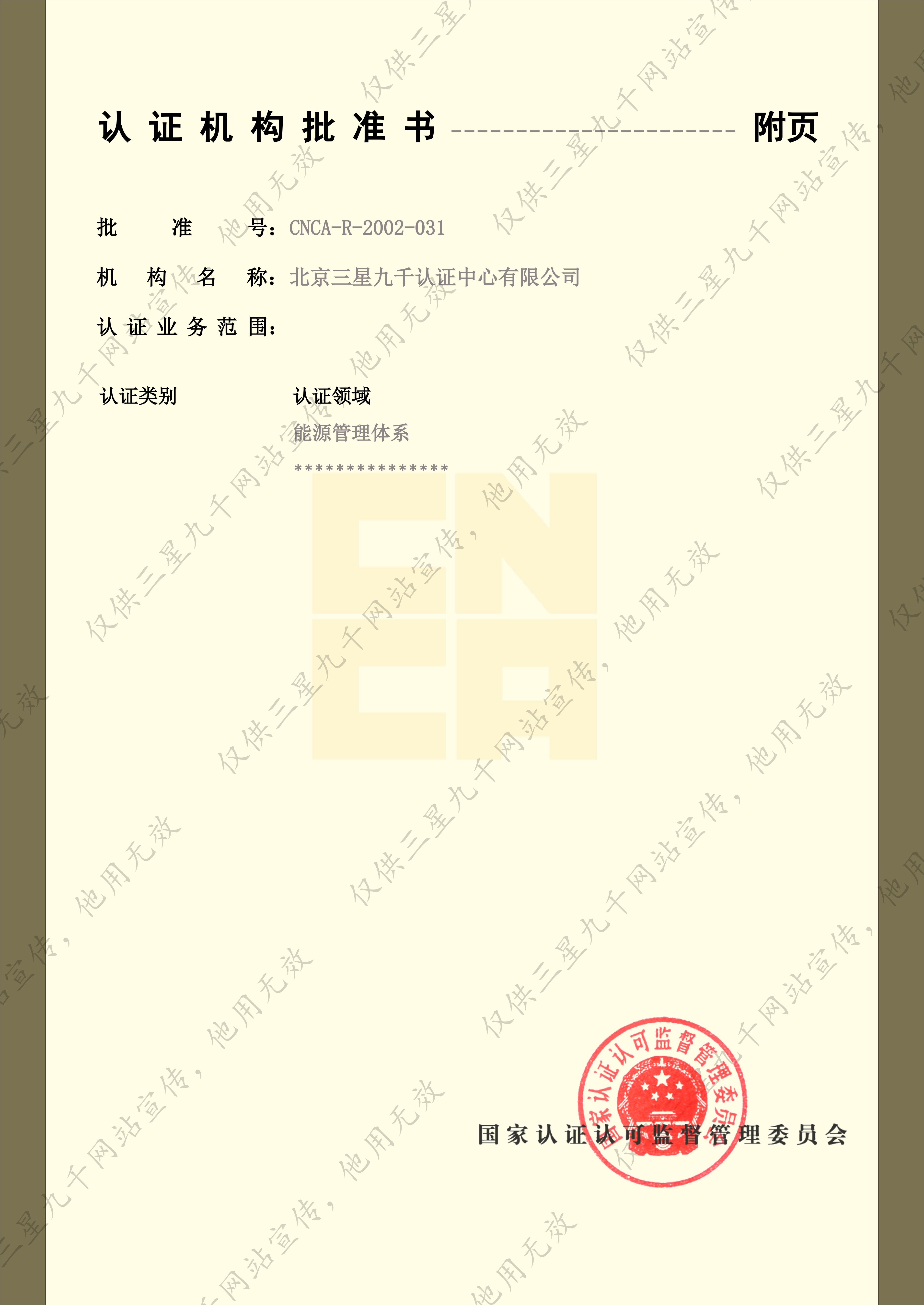 能源管理体系认证机构认可业务范围证书