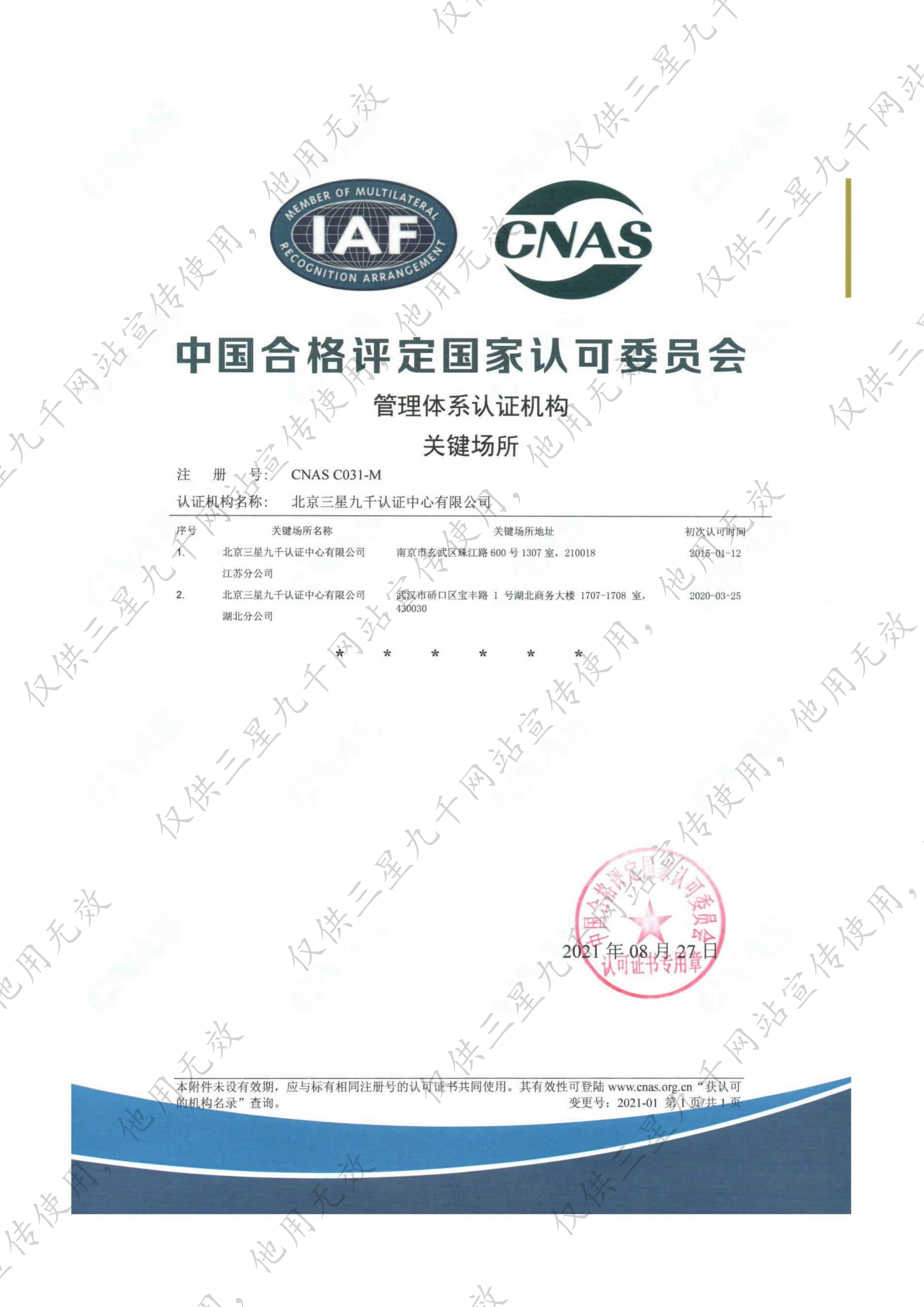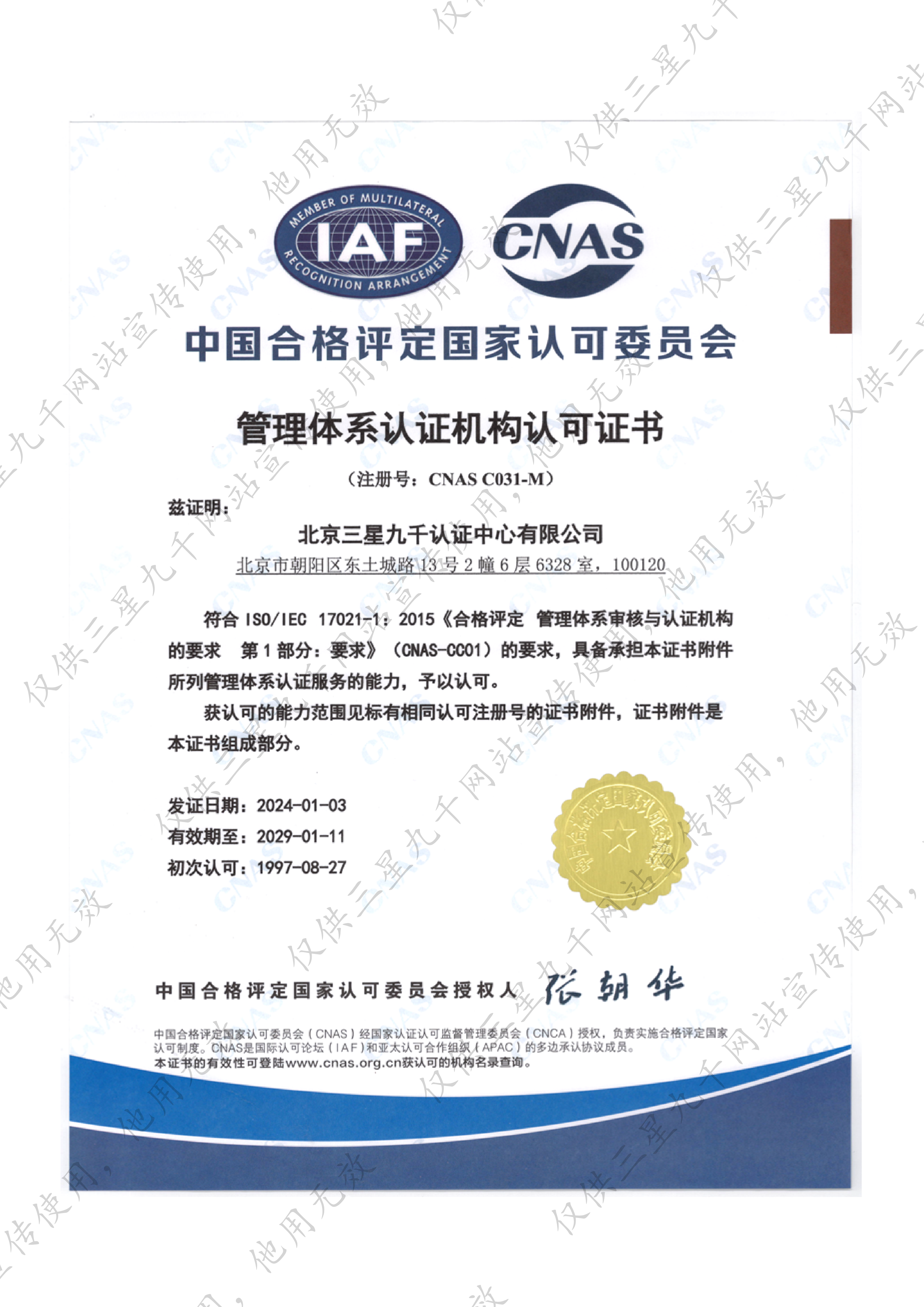 管理体系认证机构认可证书 (主证)