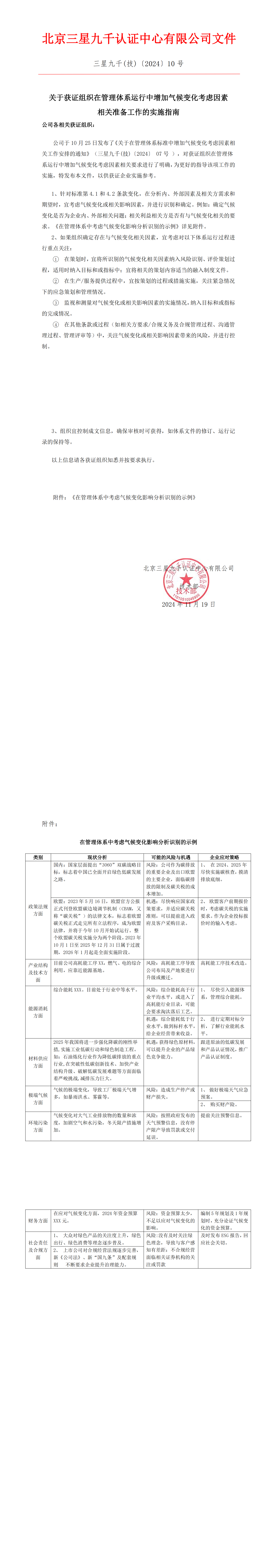 三星九千(技)〔2024〕 10号 关于获证组织在管理体系运行中增加气候变化考虑因素相关准备工作的实施指南