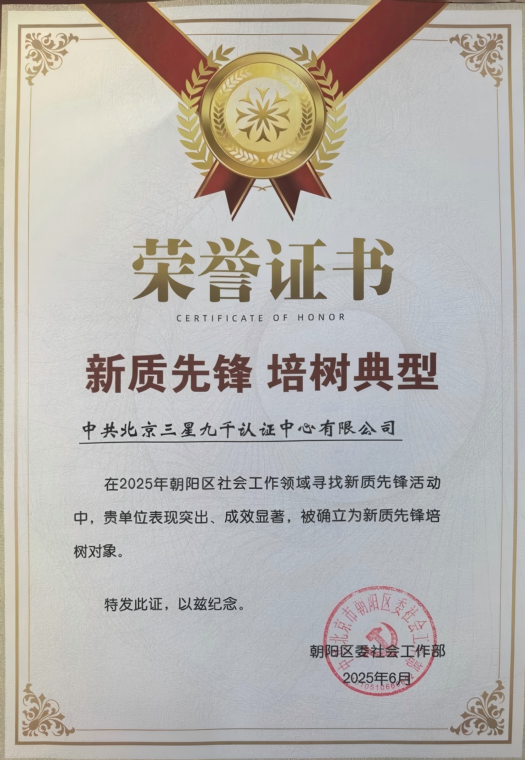 北京三星九千认证中心有限公司凭借突出表现脱颖而出,荣获 “新质先锋 培树典型” 荣誉称号。