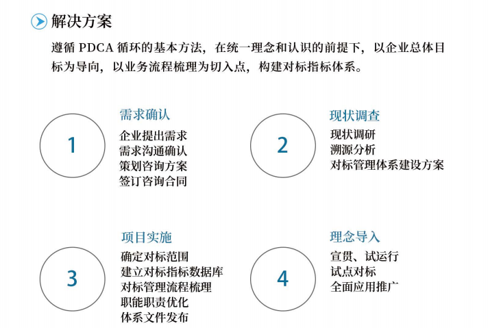 首先,参照目标管理的基本方法,以梳理业务流程,分析流程关键节点为起点,结合部门职能及工作任务分析,构建全覆盖的、结果性指标与过程性指标相兼顾的对标指标体系。其次,按PDCA方法设计对标流程框架,运用相关工具,设计、细化对标管理各阶段的具体工作节点,形成标准化的对标管理流程体系。再次,通过设计一系列表单模板,解决对标管理具体实施过程中的可操作性不强问题。然后,通过建立对标管理制度,进一步规范对标实施过程中的相关管理细节,使企业形成常态化的对标管理机制。