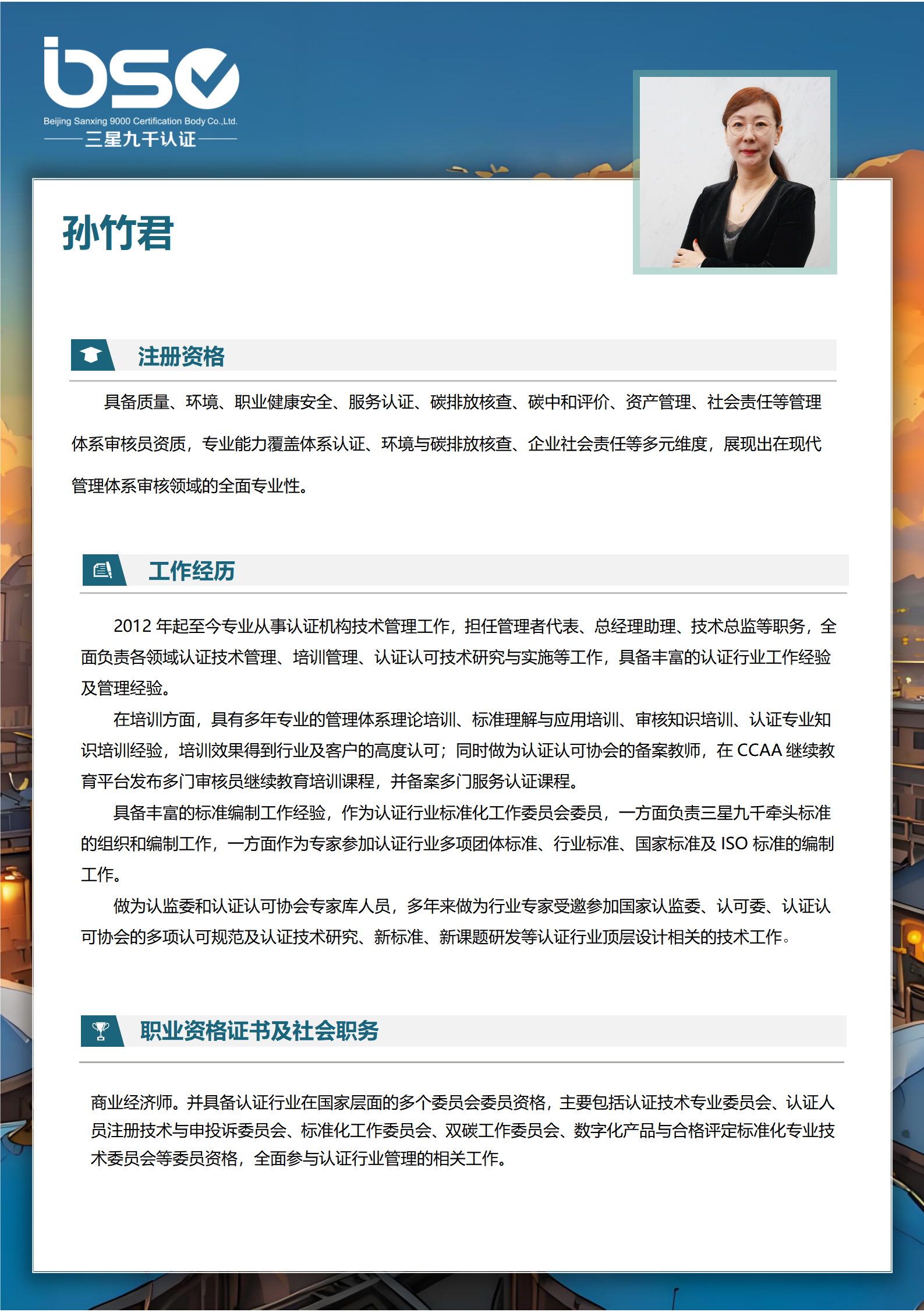 三星九千管理者代表、认证技术总监,质量、环境、职业健康安全、服务认证、碳排放核查、碳中和评价、资产管理、社会责任等管理体系审核员