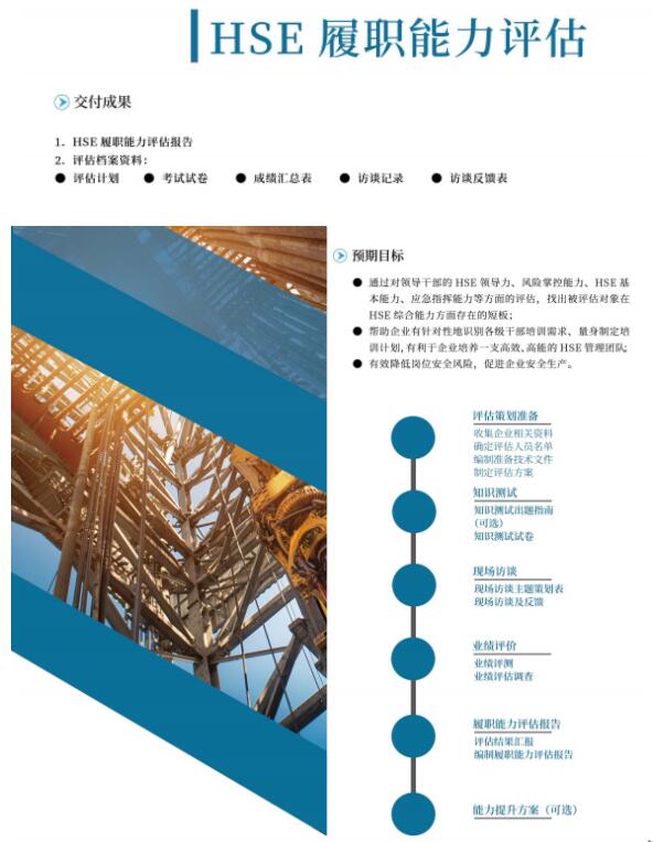 三星九千通过对领导干部的HSE领导力、风险掌控能力、HSE基本能力、应急指挥能力等方面的评估,找出被评估对象在HSE综合能力方面存在的短板;帮助企业有针对性地识别各级干部培训需求、量身制定培训计划,有利于企业培养一支高效、高能的HSE管理团队;有效降低岗位安全风险,促进企业安全生产。针对履职能力评估存在的评估标准针对性差、评估手段单调、评估结果没有有效的利用、对评估工作重视度不够等存在问题,三星九千通过多年的工作实践、探索和总结形成了《HSE履职能力评估实施规范》,对HSE履职能力在评估内容、评估标准、评估实施和结果应用等方面做了具体要求,以及一套行之有效的工具和方法。三星九千有意为各企业提供更加专业的履职能力评估技术服务。