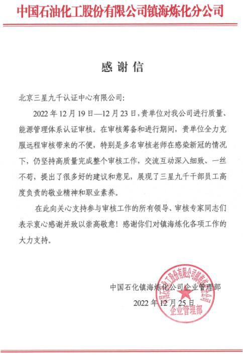 本次审核,正值疫情政策性放开、全国各城市新冠疫情疫情高峰时期,受疫情影响,审核方案和审核计划多次调整,审核组多位审核老师先后感染新冠病毒,相继发烧,审核过程困难重重。为确保审核如期实施、顺利进行,多位审核老师带病坚持审核,审核组成员团结一致,互相分担工作,在高质量地完成审核工作的同时,为企业提出了很多好的建议和意见,给企业带来了不同以往的审核体验,取得了很好的审核效果,充分体现了三星九千审核团队专业素养及职业精神。审核结束后,镇海炼化专门发来感谢信,对公司审核组工作表示认可。