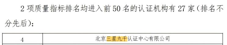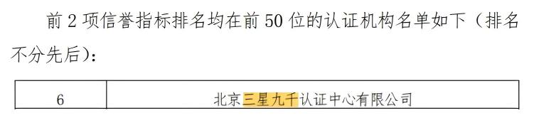 北京三星九千认证中心有限公司(以下简称“三星九千”)在质量、创新、品牌、效益等多项评价结果排行中榜上有名。《报告》显示,三星九千在“认证质量评价结果”领域中2项质量指标排名位居前列,“信誉评价结果”中2项信誉指标排名也同样领先。其中,良好认证审核案例入围数综合排名第7位,注册认证人员充分率中综合排名第21位;在“创新评价结果”的主持/参与编制的国标、行标数中,三星九千综合排名第31位,专利授权、软件著作权数位列第23位;体现认证机构品牌效益的“认证证书转出比例低”“单张证书纳税贡献率”等多项指标排名靠前。